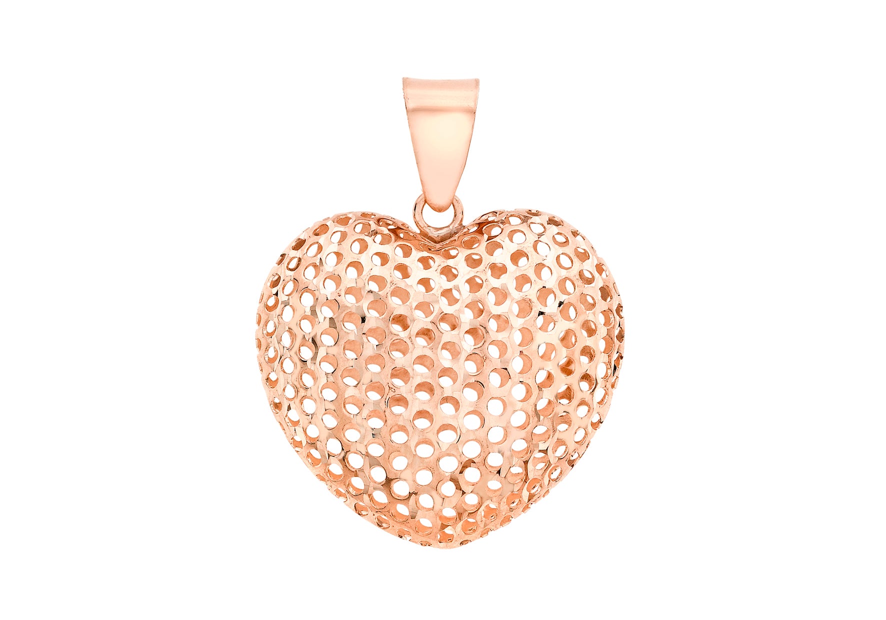 Delicate yet distinctive, this pendant offers a refined expression of modern romance. The openwork heart is intricately woven in a fine mesh pattern, creating a subtle interplay of texture and light against the warm blush tones of polished rose gold.