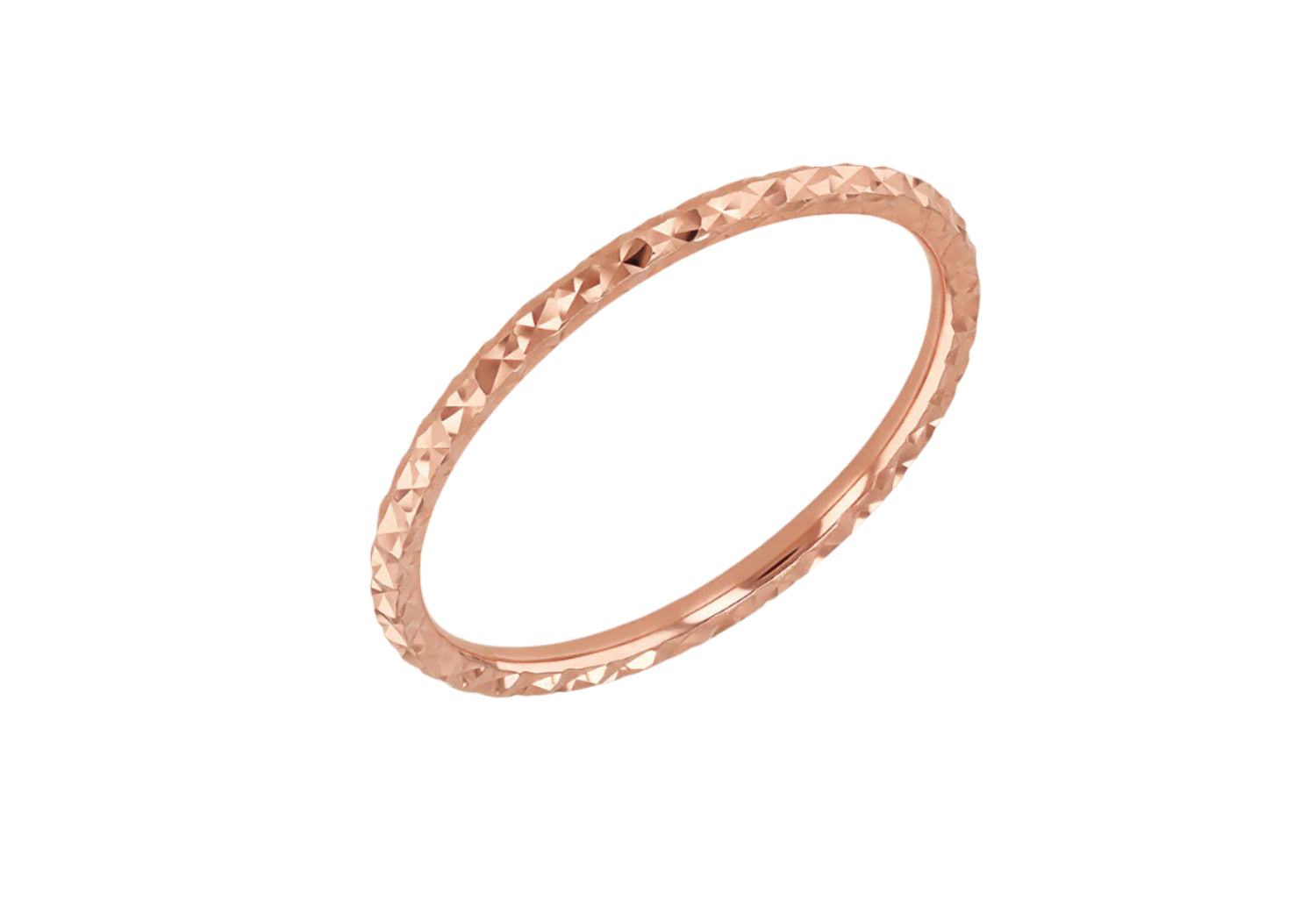 A refined take on minimalist elegance, this ring radiates warmth with its soft blush tones and delicate shimmer. The slim silhouette is finished with intricate diamond-cut facets that catch the light from every angle, enhancing the romantic hue of rose gold.