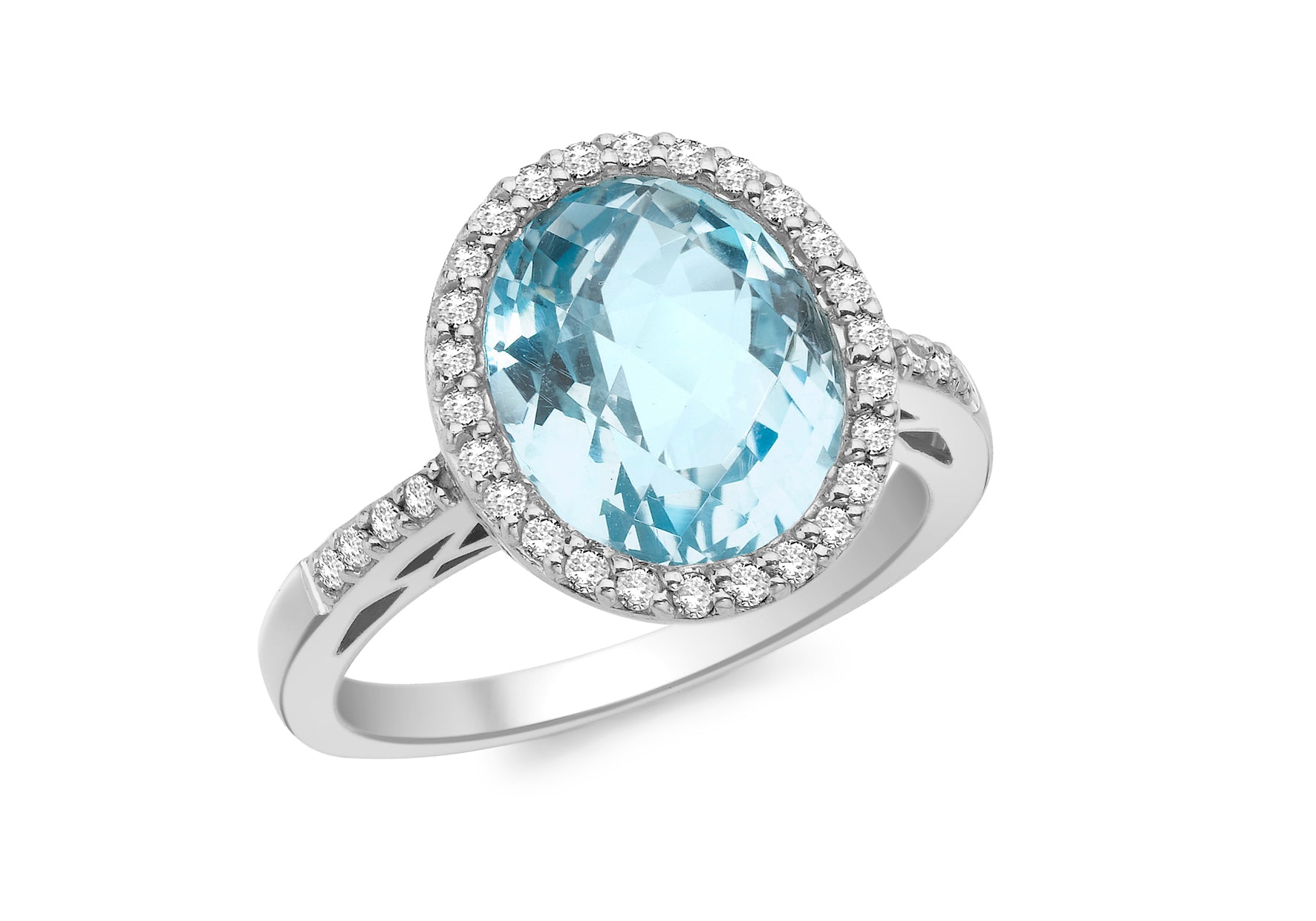 Average Carat Weight: 0.23ct Ring Shank: 2mm Width: 12mm Height: 13mm Finish: Polished Setting: Claw Stone Details: 34 x Round Diamonds, 1x 10mm x 8mm Blue Topaz Gemstone Style: Stone Set Product Type: Rings Metal Colour: White Metal: 9ct Gold