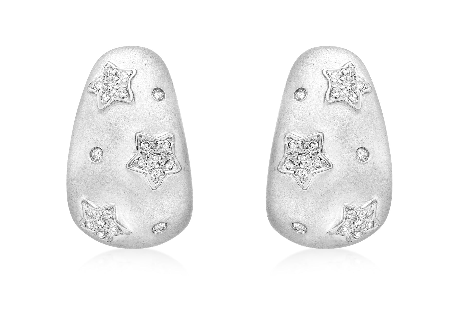 These earrings balance refined minimalism with a touch of celestial allure. The softly curved half-band form is finished in a smooth satin texture, offering a gentle contrast to the polished diamond-set stars scattered across the surface.