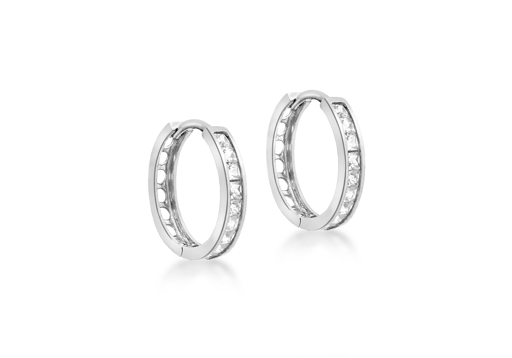 Width: Tube 2.62mm Diameter: 15mm Finish: Polished Fitting: Creole Setting: Channel Stone Details: 20 x 1.75mm Square White CZs Style: Creole Product Type: Earrings Metal Colour: White Metal: 9ct Gold