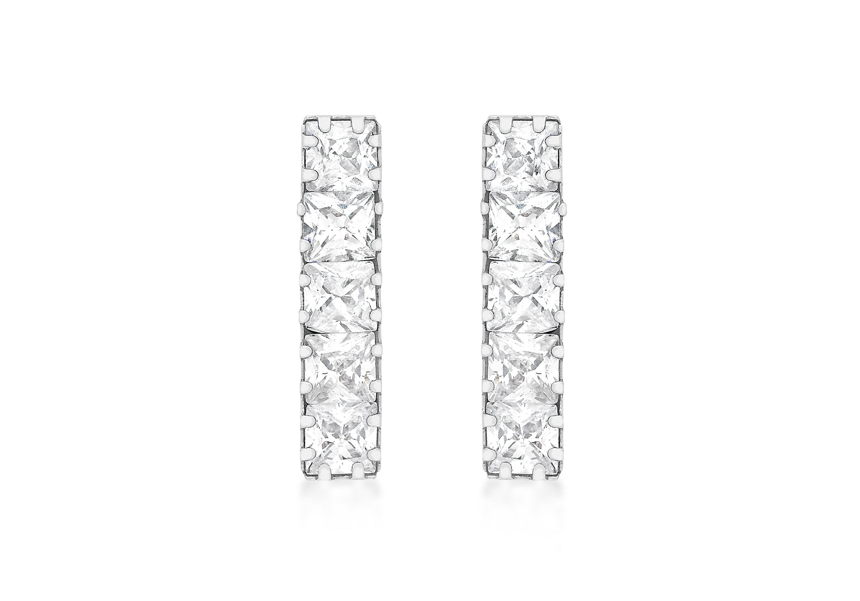 Width: 3mm Height: 15mm Finish: Polished Fitting: Post Setting: Channel Stone Details: 10 x 3mm x 3mm Square White CZs Style: Stud Product Type: Earrings Metal Colour: White Metal: 9ct Gold