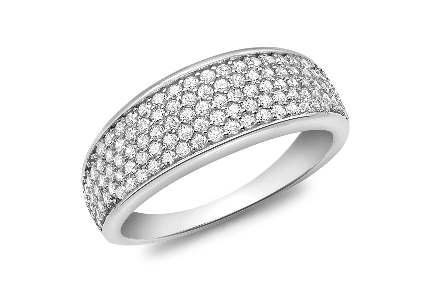 Sleek and luminous, this exudes contemporary elegance with a refined edge. The gently narrowing band creates a sculptural silhouette, while the surface is adorned with a fine pavé of white zirconia, each stone precisely set to capture a delicate shimmer.