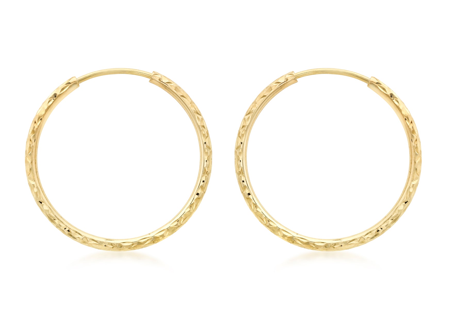 9ct Yellow Gold 27mm Diamond Cut Round Hoop Earrings Diameter: 27mm Fitting: Endless Hoop Style: Hoop Product Type: Earrings Metal Colour: Yellow Metal: 9ct Gold