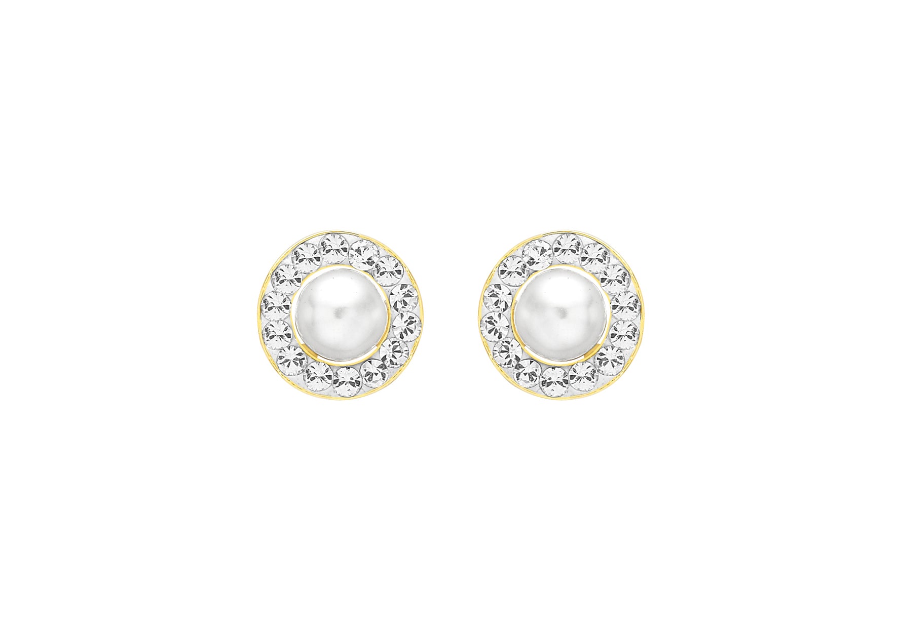 Diameter: 8.5mm Finish: Polished Fitting: Post Setting: Invisible Stone Details: 2 x 5.25mm White Round Pearl, 28 x 1mm White Round CZs Style: Stud Product Type: Earrings Metal Colour: Yellow Metal: 9ct Gold