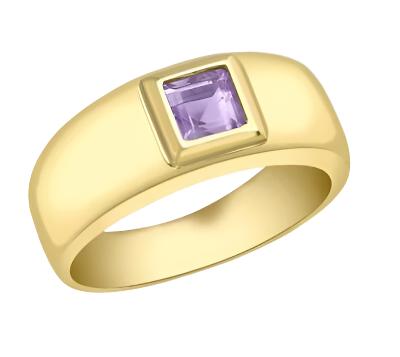 Ring Shank: 4mm Setting: Rubover Stone Details: 4mm x 4mm Amethyst Style: Stone Set Product Type: Rings Metal Colour: Yellow Metal: 9ct Gold