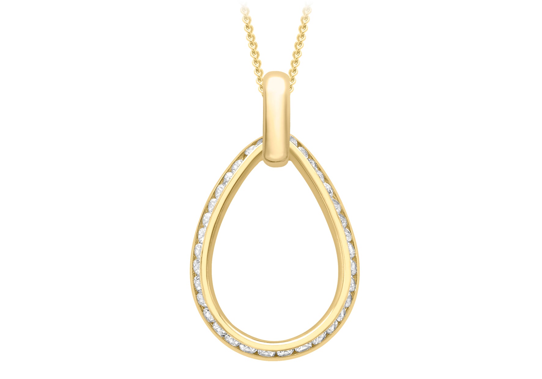 Designed with graceful sophistication, the pendant showcases a beautifully contoured teardrop silhouette. Crafted in rich yellow gold, the pendant offers a warm, polished glow that enhances the piece's refined shape. The outer edge of the teardrop is delicately traced with precision-set zirconia stones, adding a subtle brilliance that accentuates the gentle curve of the gold.
