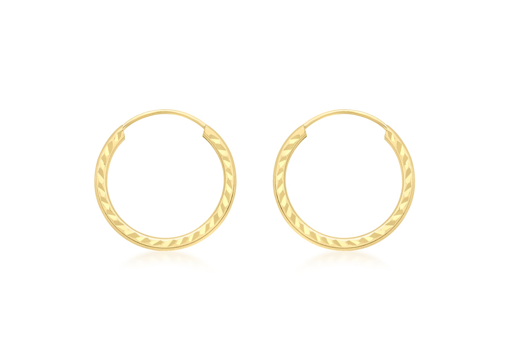 9ct Yellow Gold Diamond Cut 15mm Sleeper Hoop Earrings Diameter: 15mm Fitting: Endless Hoop Style: Hoop Product Type: Earrings Metal Colour: Yellow Metal: 9ct Gold