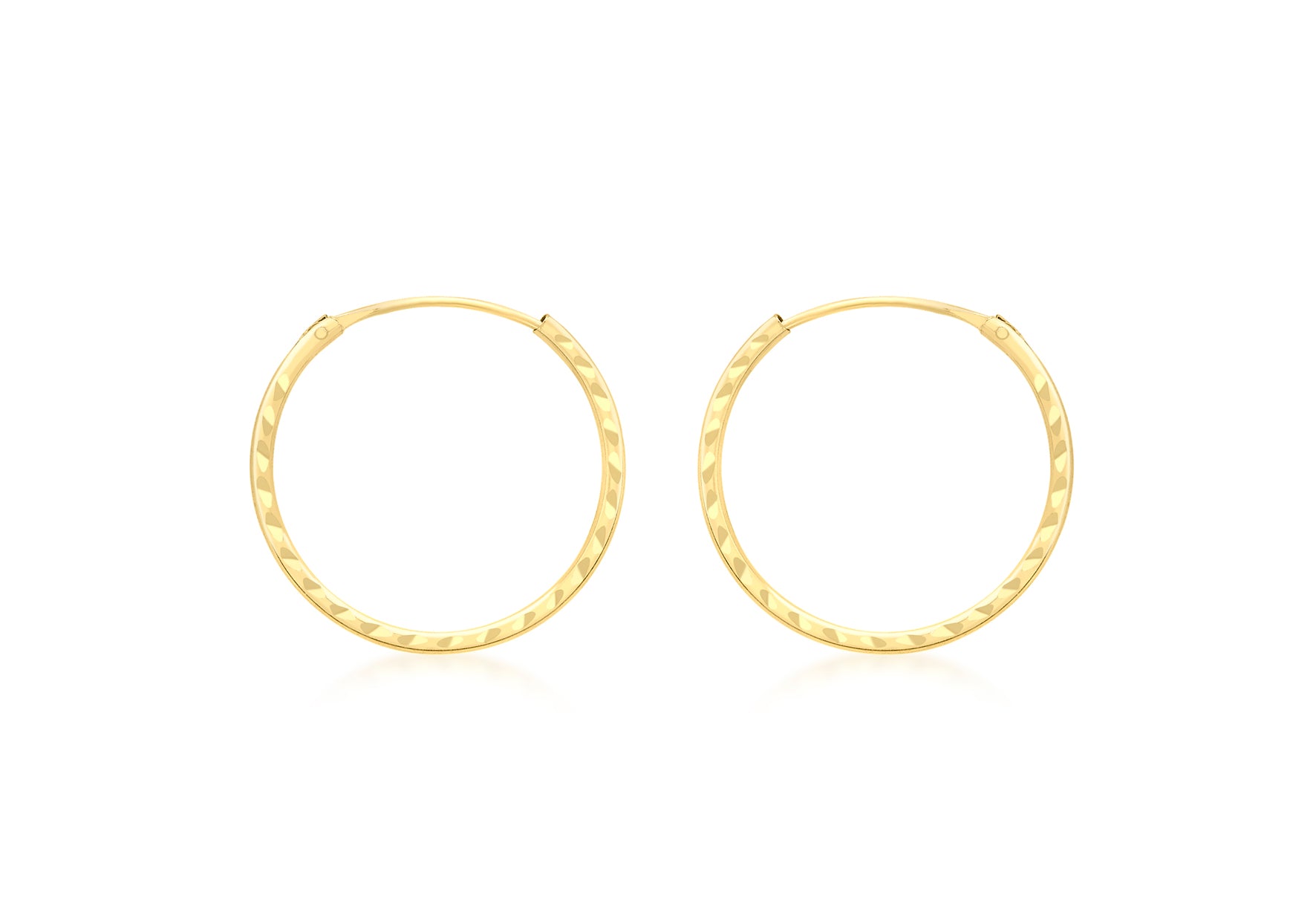 9ct Yellow Gold Diamond Cut 18mm Sleeper Hoop Earrings Diameter: 18mm Fitting: Endless Hoop Style: Hoop Product Type: Earrings Metal Colour: Yellow Metal: 9ct Gold