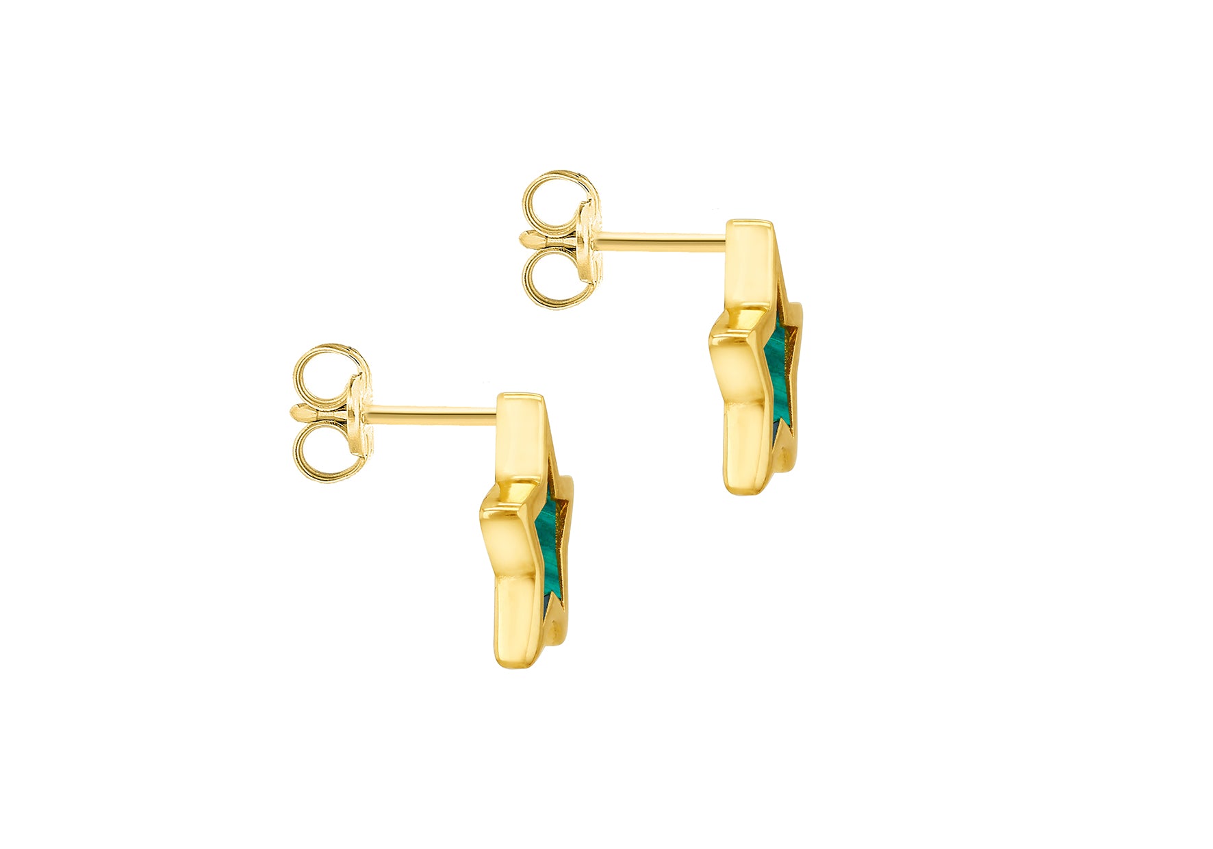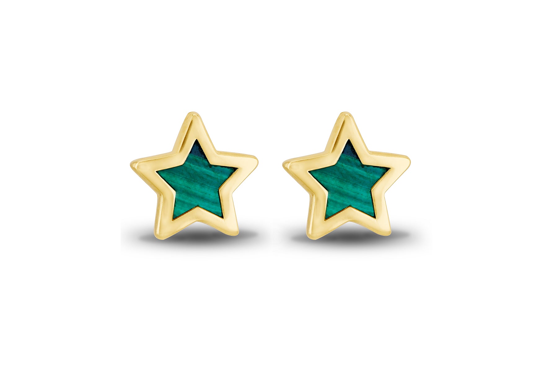Width: 8mm Height: 8mm Finish: Polished Fitting: Post Setting: Bezel Stone Details: 2 x 7mm Malachite Star Style: Stone Set Product Type: Earrings Metal Colour: Yellow Metal: 9ct Gold