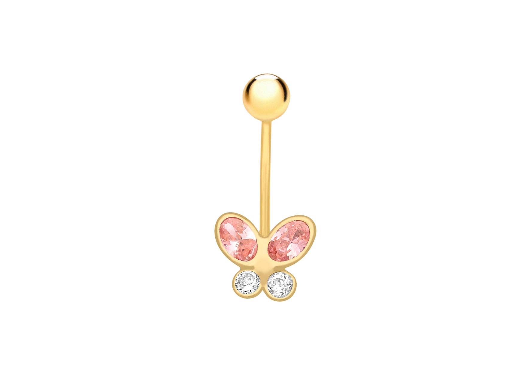 9ct Yellow Gold Pink & White Zirconia Butterfly Belly Bar Width: 10mm; Height: 24mm; Fitting: Screw; Setting: Rubover; Stone Details: 5x3mm Pink CZ Stones/2mm CZ Stones Metal Colour: Yellow Metal: 9ct Gold