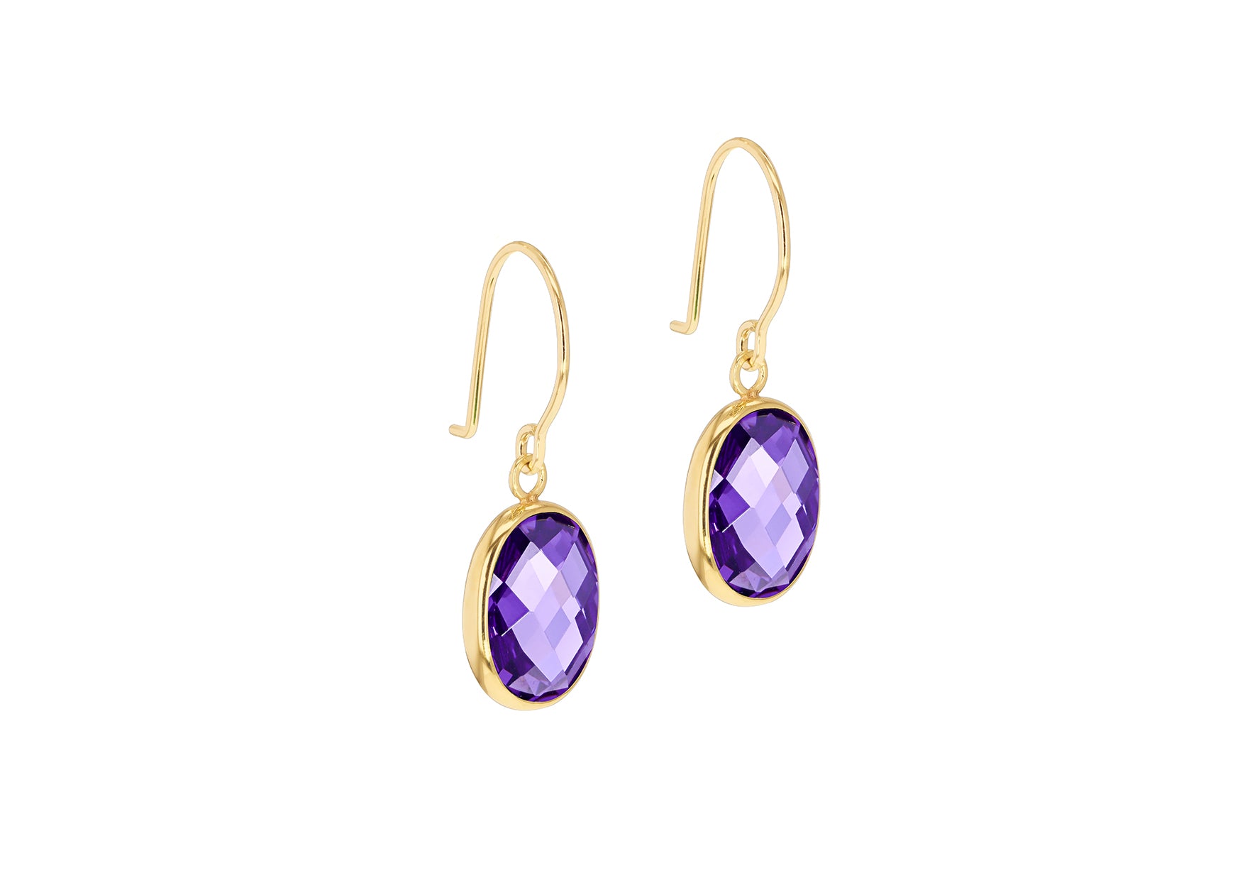 Width: 8.2mm Height: 22mm Finish: Polished Fitting: Hook Stone Details: 2 x 10mm x 8mm Purple Oval CZ Style: Drop Product Type: Earrings Metal Colour: Yellow Metal: 9ct Gold