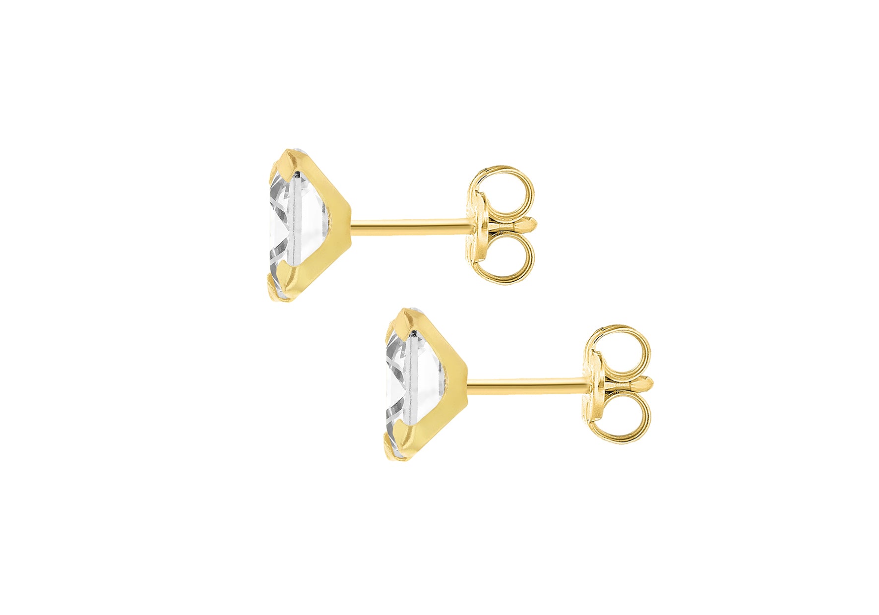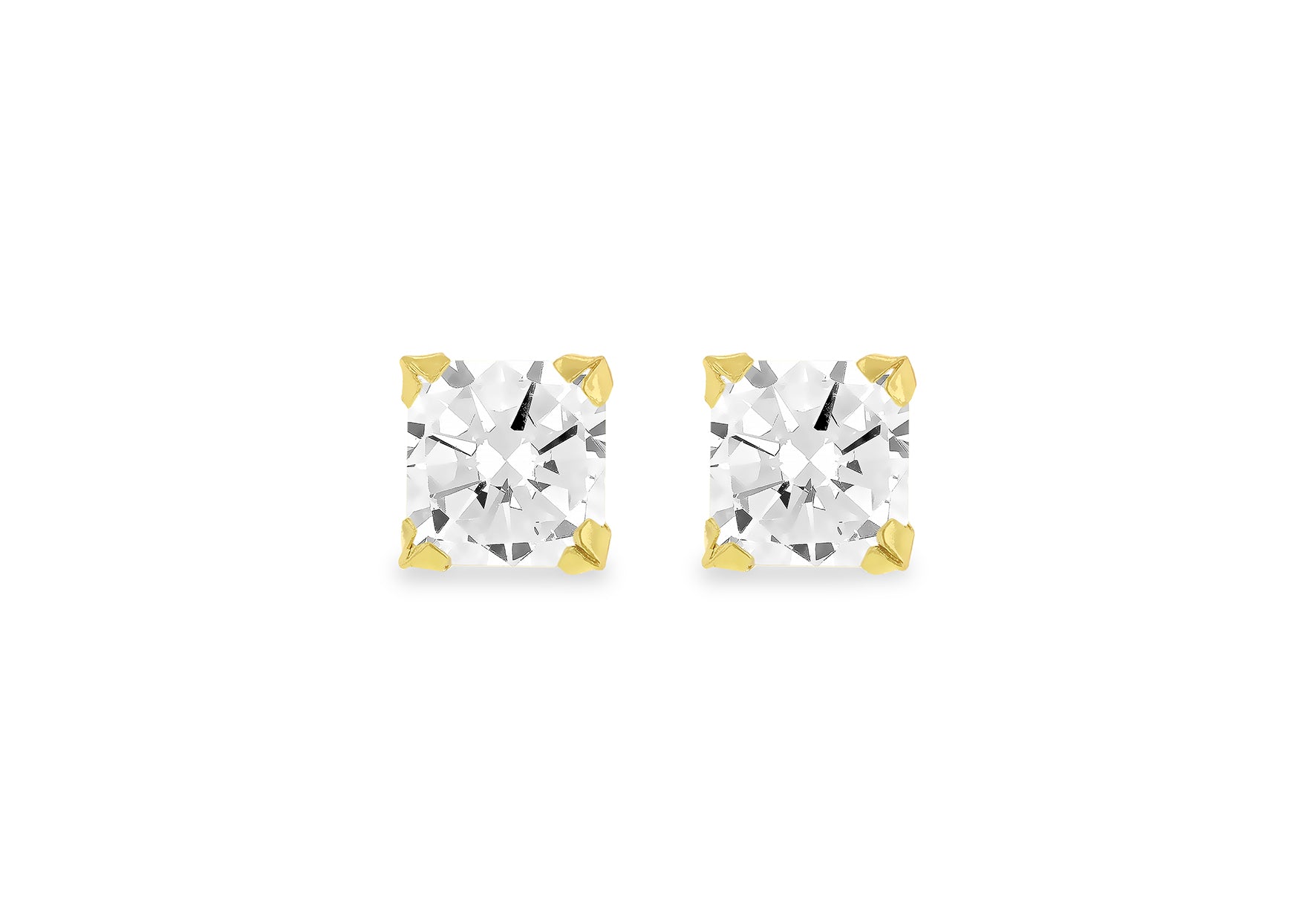 Details: Depth 4mm Width: 6mm Height: 6mm Finish: Polished Fitting: Post Setting: Claw Stone Details: 2 x 6mm Square White CZ Style: Stud Product Type: Earrings Metal Colour: Yellow Metal: 9ct Gold