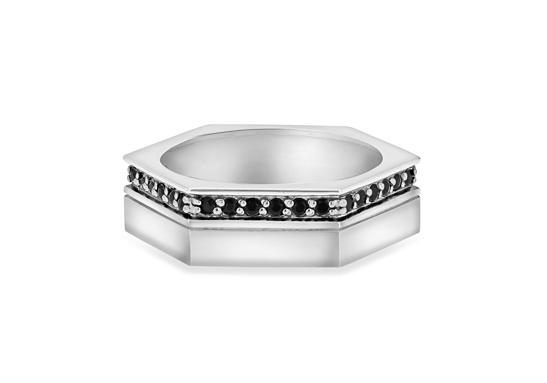 The ring embodies modern sophistication with a bold, architectural edge. Crafted from solid sterling silver, the ring showcases a sleek hexagonal face, pavé-set with rich black sapphires that lend a refined depth and subtle sparkle.