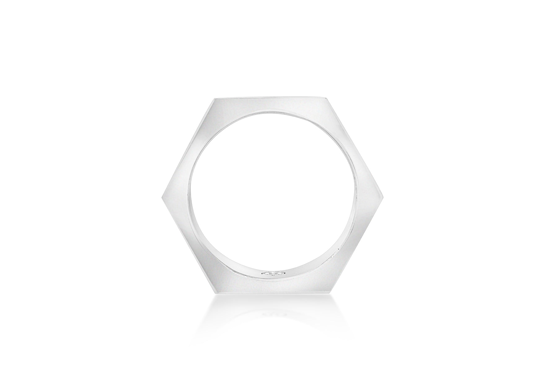The geometric form is accentuated by clean, polished lines, creating a striking balance of strength and elegance. Designed for the contemporary gentleman, this piece offers a distinctive statement of style perfect for both everyday wear and special occasions.