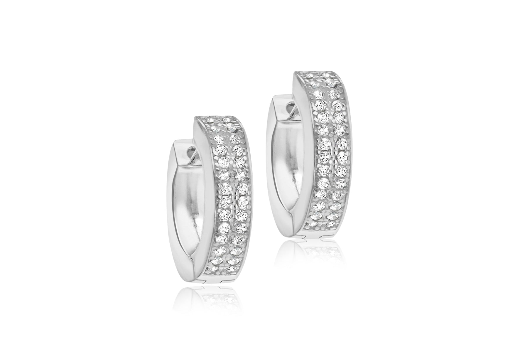 Width: 20.1mm Height: 18.1mm Finish: Polished Fitting: Hinged Post Setting: Pave Stone Details: 42 x 1mm Round White CZs Style: Creole Product Type: Earrings Metal Colour: Silver Metal: Silver