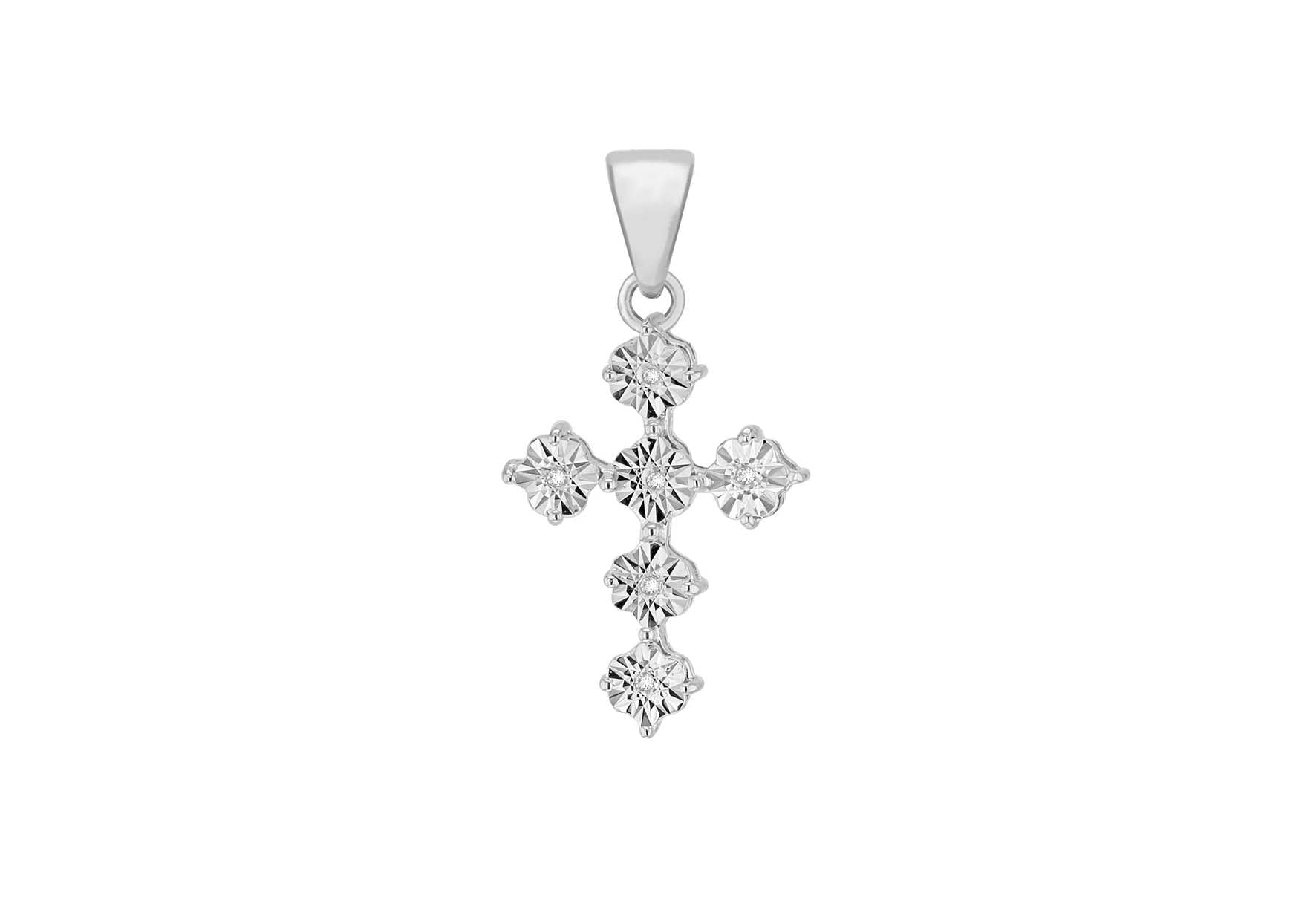 Pendant Height: Including Bail 33.7mm Pendant Width: 17.7mm Finish: Diamond Cut / Rhodium Plated Setting: Claw Stone Details: 6 x 1.3mm Round White CZ Style: Religious Product Type: Pendants Metal Colour: Rhodium Metal: Silver: *Includes 18" Inch Chain