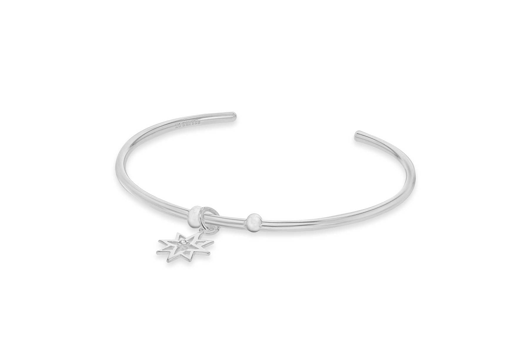 Sterling Silver Zirconia Hanging Cutout-Star Bangle Shape: Oval; Details: Star 10.3mm x 13.2mm; Width: 51mm; Height: 43mm; Finish: Polished; Setting: Rubover; Stone Details: 1 x 1mm Round White CZ; Clasp: Cuff; Style: Stone Set Metal Colour: Silver Metal: Silver