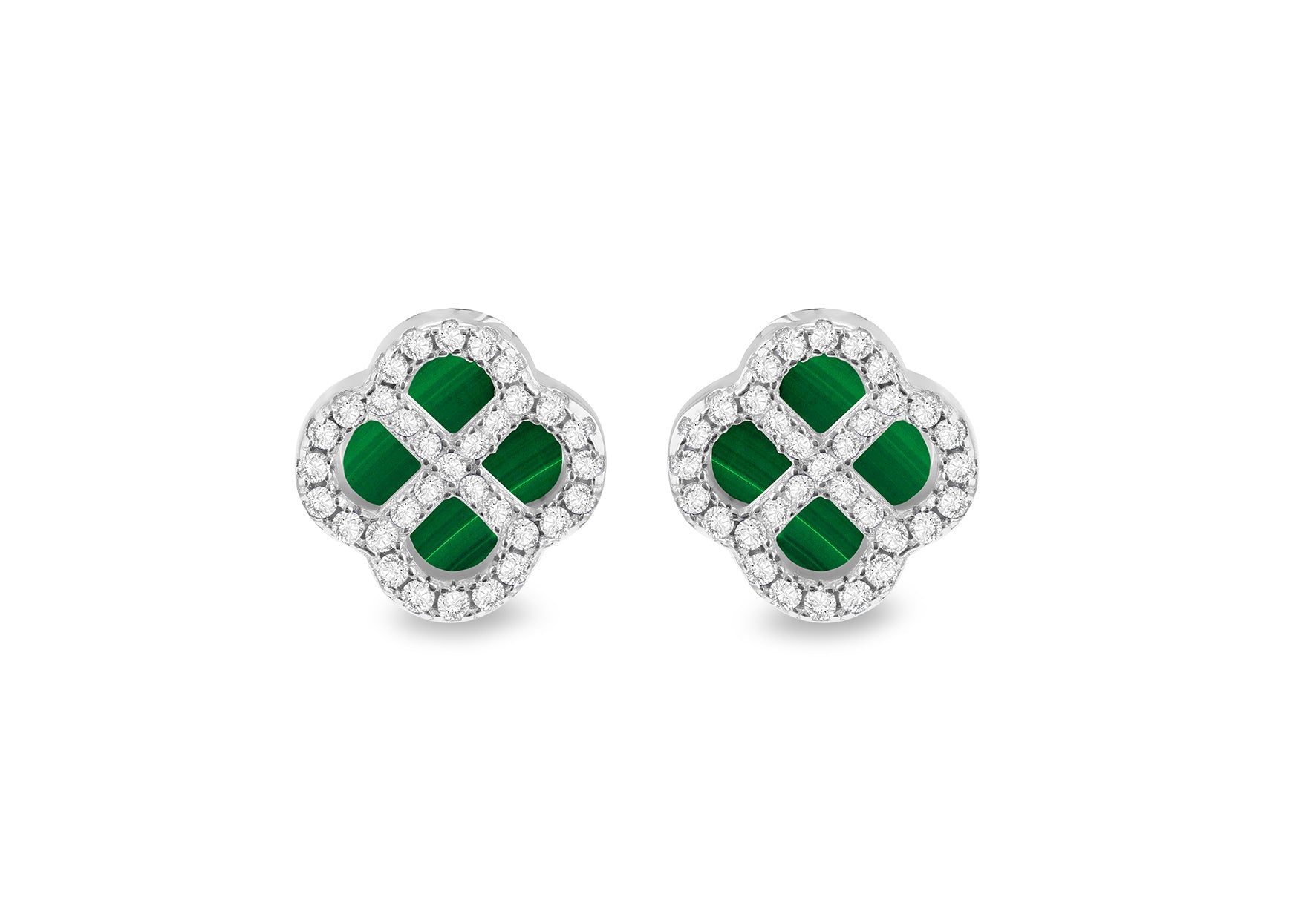 Width: 11mm Height: 11mm Finish: Polished Fitting: Post Setting: Claw Stone Details: 48 x 1.1mm White Round CZ 18 x 1mm White Round CZ 2 x 8.8mm Malachite Clover Style: Stone Set Product Type: Earrings Metal Colour: Silver Metal: Silver