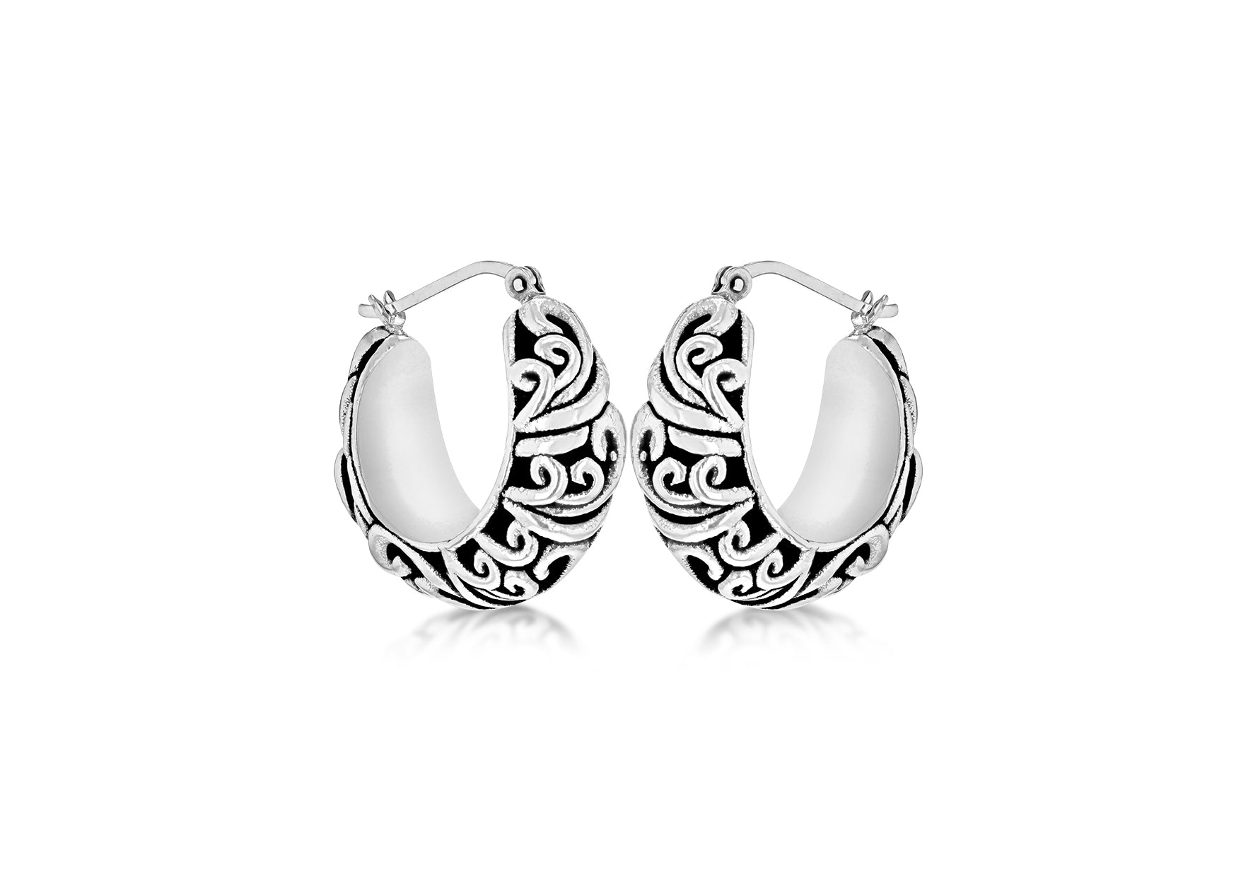 Width: 25mm Height: 24mm Finish: Oxidised Fitting: Hinged Post Style: Creole Product Type: Earrings Metal Colour: Oxidised Metal: Silver