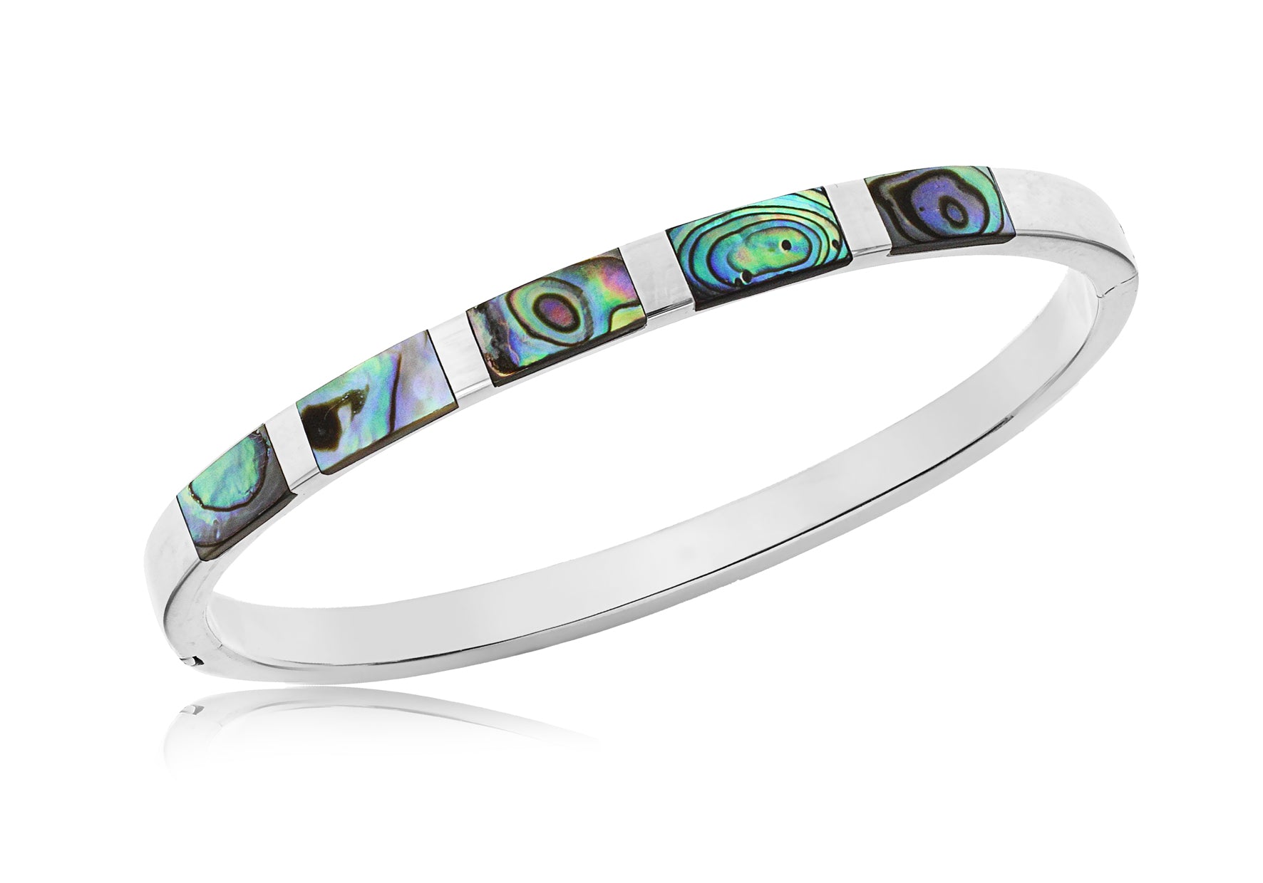 Shimmering with the iridescent hues of the ocean, this sterling silver bangle is adorned with a captivating Paua sea shell inlay. Each shell fragment reveals a mesmerising play of blues, greens, and purples, echoing the natural beauty of New Zealand’s coastal waters.