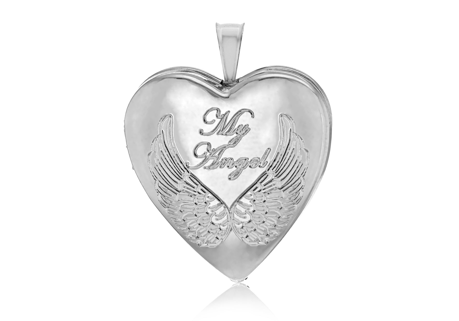 Sterling Silver Rhodium Plated Heart 'My Angel' Locket Details: Polished Front, Satin Back; Pendant Height: Including Bail 25mm; Pendant Width: 19.5mm; Finish: Rhodium Plated; Style: Lockets Metal Colour: Silver Metal: Silver
