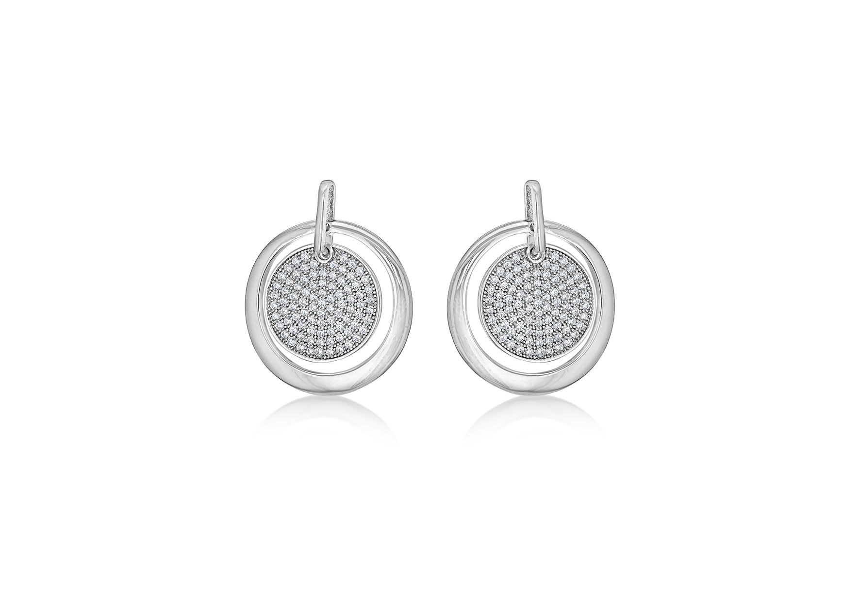Sterling Silver Rhodium Plated CZ Stone Set Disc Circle Drop Earrings Width: 13.3mm; Height: 18.1mm; Finish: Rhodium Plated; Fitting: Post; Setting: Pave; Stone Details: 68 x 0.9mm Round White CZs; Style: Drop Metal Colour: Silver Metal: Silver