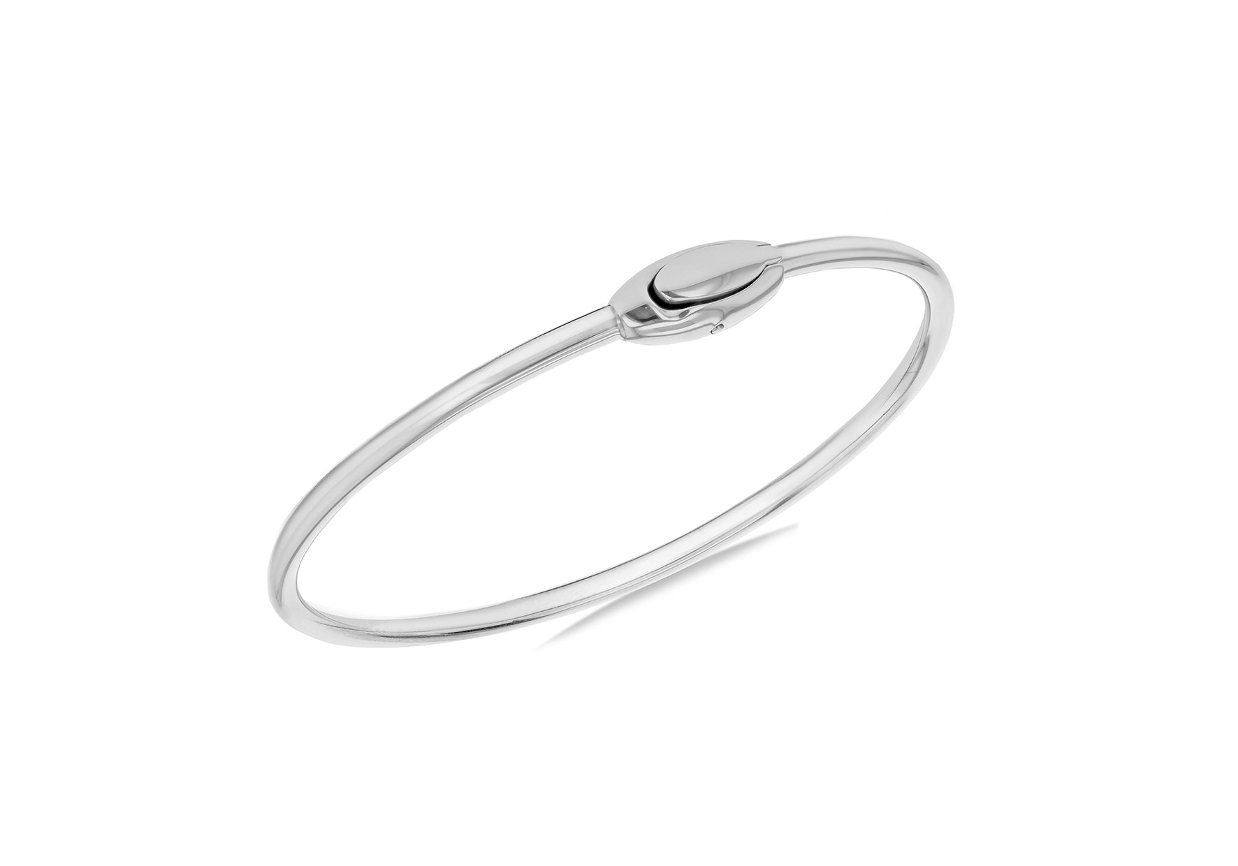 Shape: Oval Bangle Width: 2.8mm Width: 64.5mm Height: 53.5mm Finish: Rhodium Plated Clasp: Box Style: Plain Product Type: Bangles Metal Colour: Rhodium Metal: Silver