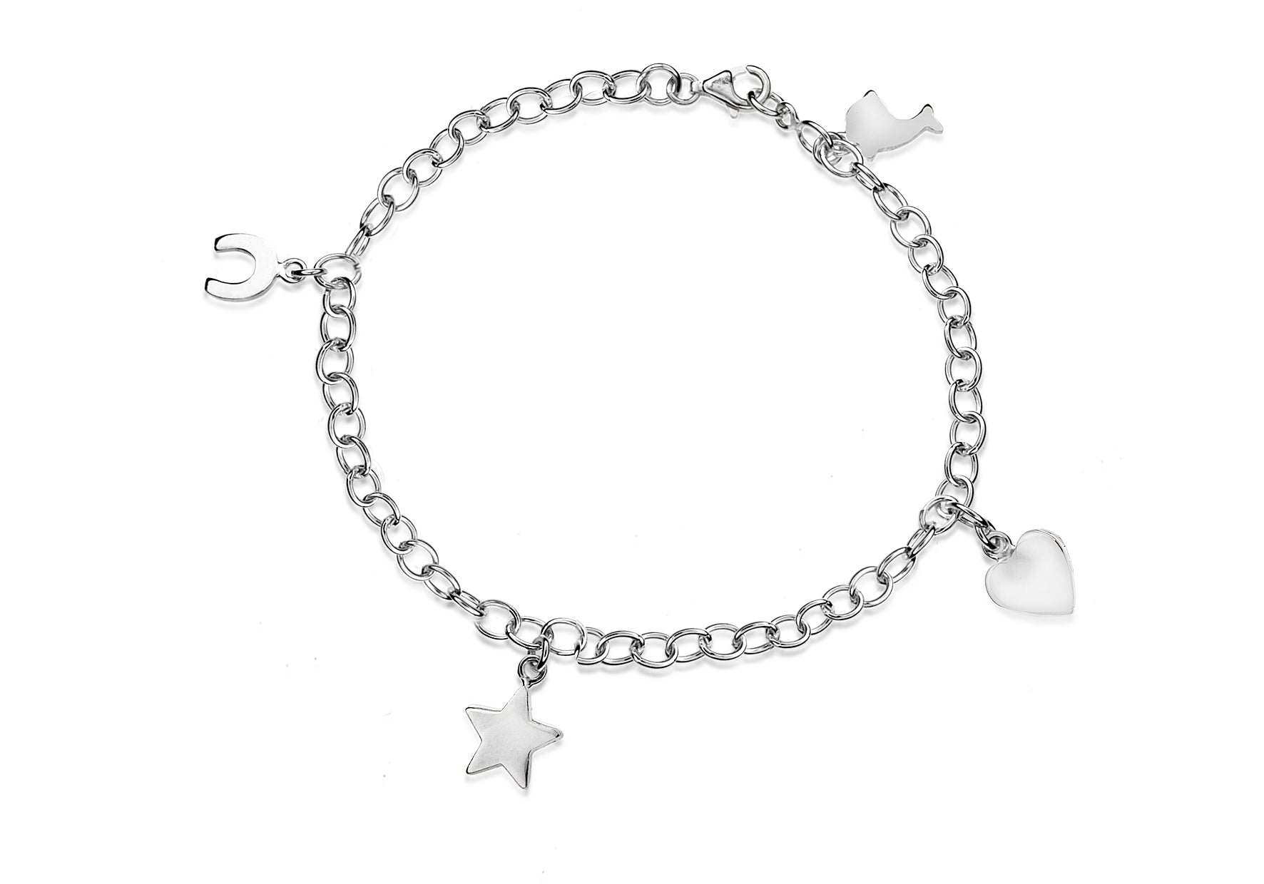 Sterling Silver Rhodium Plated Four Charm Anklet Details: Horse Shoe 7.5mm x 10mm, Star 9.5mm x 12.3mm, Heart 8.3mm x 11mm, Dolphin 8.3mm x 12.9mm; Length: 23cm; Width: 4mm; Finish: Rhodium Plated; Clasp: Lobster; Style: Fancy Metal Colour: Silver Metal: Silver