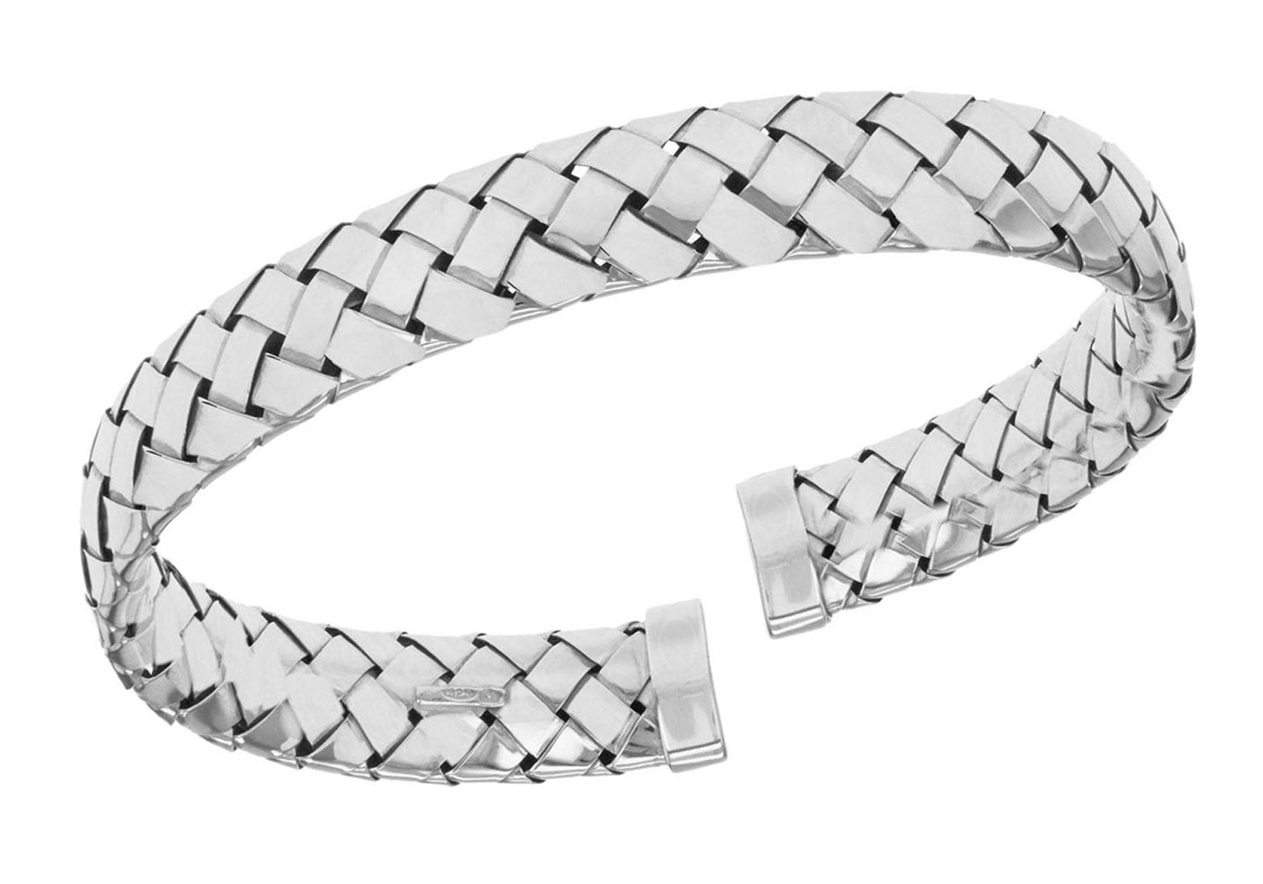 Understated yet refined, this bangle showcases a tightly interlaced design, creating a soft, textile-like texture from precious metal. Expertly finished with a layer of rhodium plating, the bangle offers added brilliance, resistance to tarnish, and a lasting polished look.
